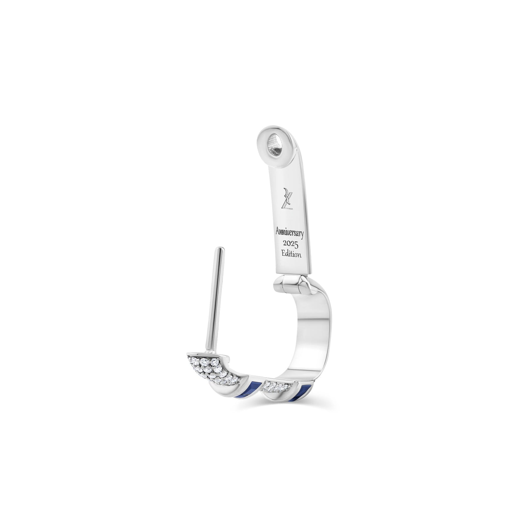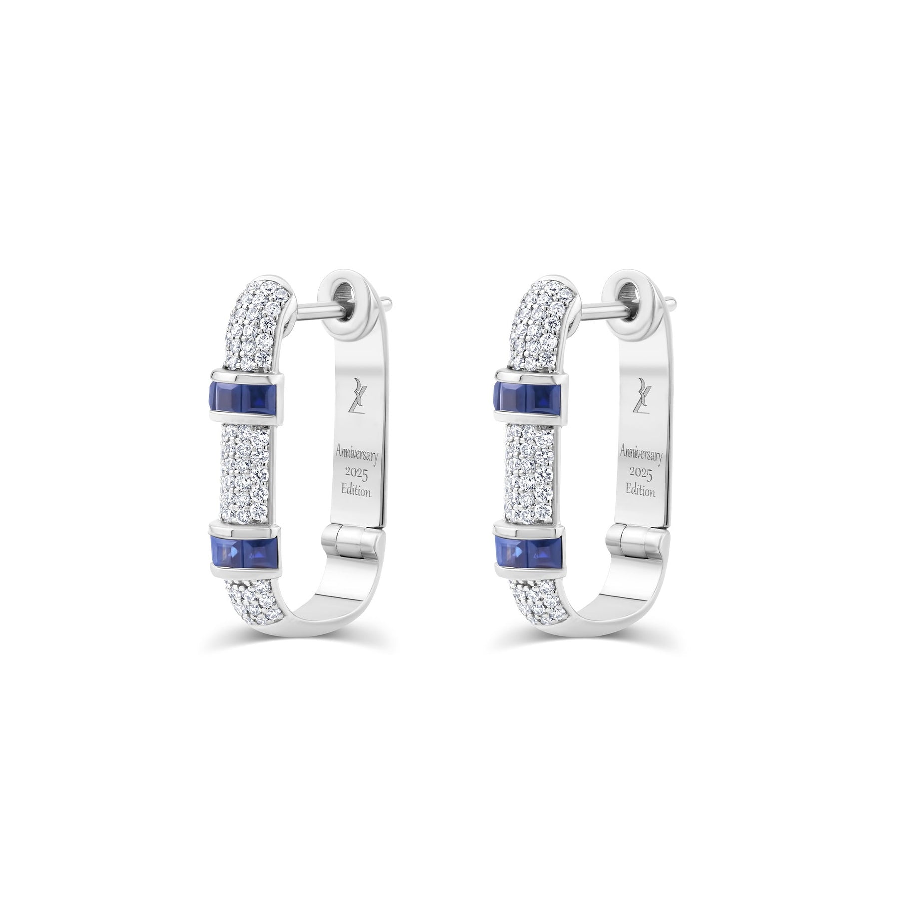 This Anniversary 2025 Edition introduces a brand-new size of the Silhouette, 20mm, a size we have never created before with 4 rows of diamonds. Somewhere between the Silhouette 17mm and Silhouette 26mm. Each earring is set with princess cut Blue Sapphires, a cut that gives that refined vintage feeling of quiet luxury and old-money elegance. Sophisticated, romantic, and timeless.