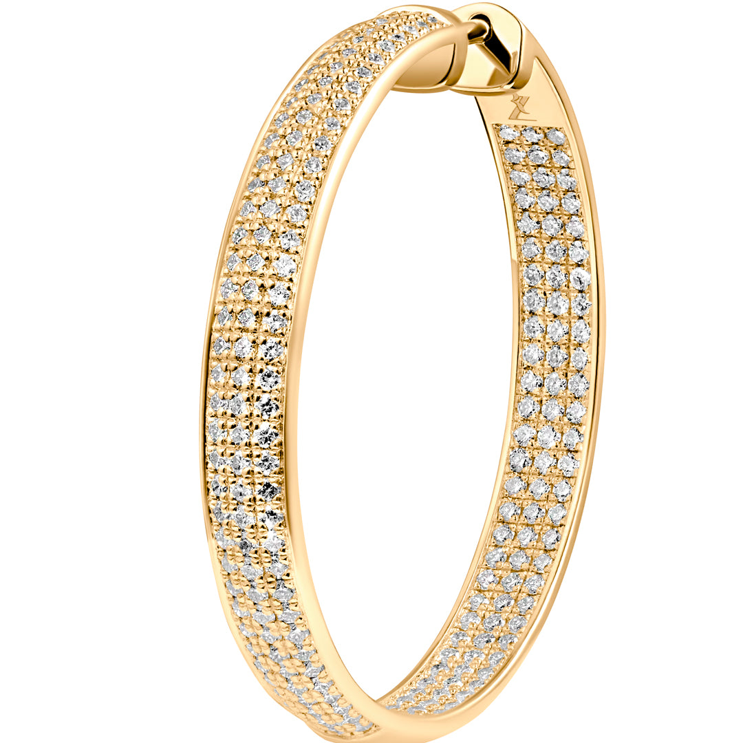 A dazzling evolution of our iconic Virtue Hoops. The Virtue Birthday Edition earrings are an elevated expression of brilliance, boldness, and refined design. Sculpted in 18k gold and set with over 2 carats of proudly ethically sourced natural diamonds, each hoop becomes a radiant circle of light, reflecting elegance from every angle. Their generous silhouette offers a striking yet graceful presence, while each diamond glistens with the precision of a star in a carefully composed constellation.